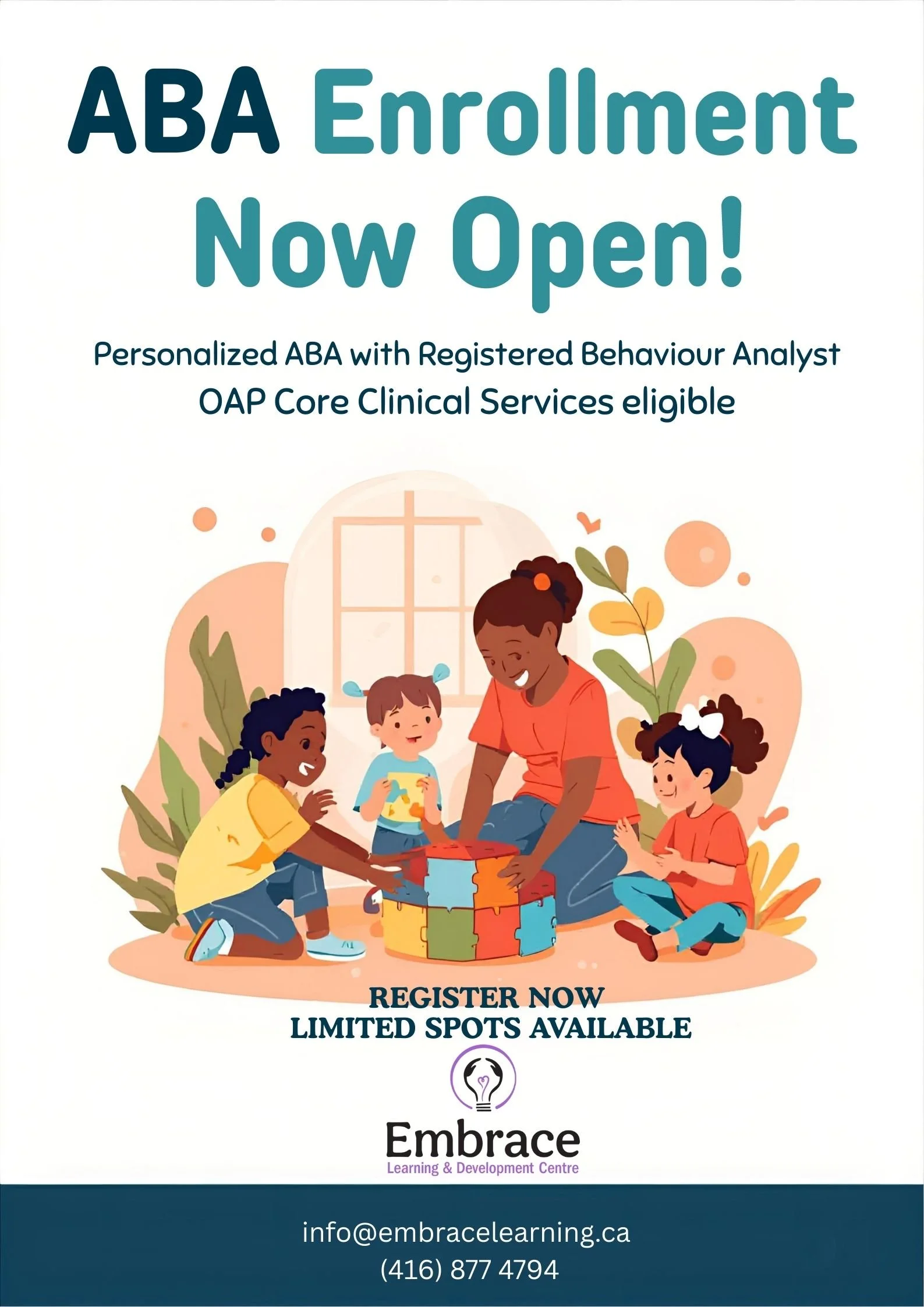 Here at Embrace Learning and Development Centre, we strive to provide the best support for every child by providing professional, evidence-based Applied Behaviour Analysis (ABA) therapy and Autism services. We are committed to fostering growth, independence, and progress that prioritizes each individual’s goals. We actively communicate and listen to families and clients, making strong relationships, putting first individualized attention, and maintaining an environment that is safe.